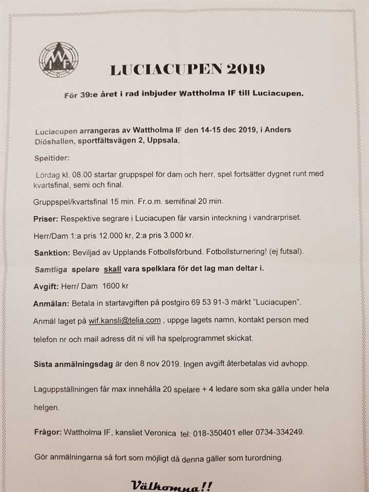 Nu är anmälan öppen för vår inomhuscup. Cupen spelas på konstgräs och är öppen för damlag och herrlag. Välkommen med er anmälan. Först till kvarn gäller. /Cupledningen Wattholma IF 15 okt 2019 0kommentarer