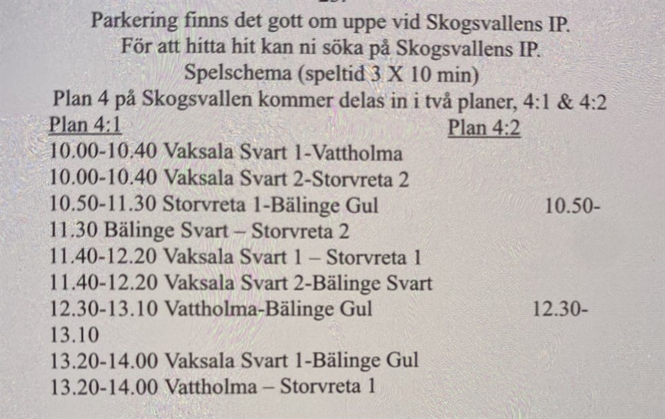 Hej! Här kommer spelschema och lite info kring poolspelet på söndag som är i Storvreta. Vi har första matchen kl 10.00 Samling 9.30 vid Skogsvallen IP Medtag: shorts, fotbollsstrumpor, benskydd, fotbollsskor och vattenflaska. Eventuell lunch och mellis. Det finns kiosk på plats som det kommer finnas möjlighet till att köpa lunch och mellis om man vill det. Ser fram emot o se grabbarna på planen igen! Mvh Jonas och Erica